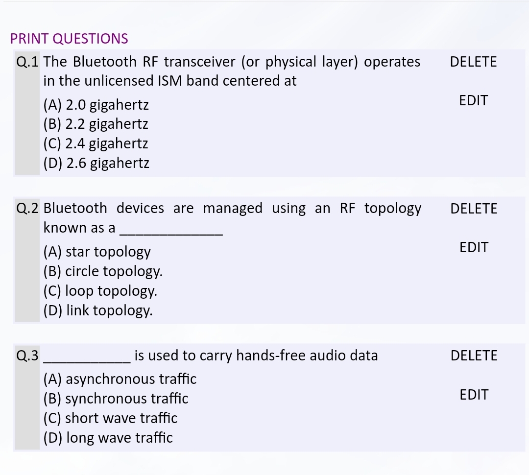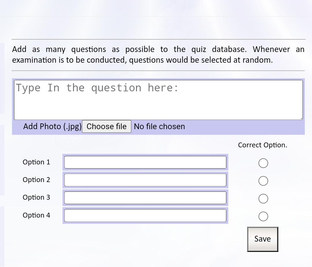Type the question, type options, then select the correct option. Then Save.